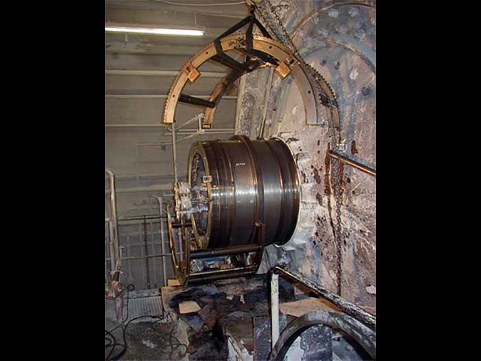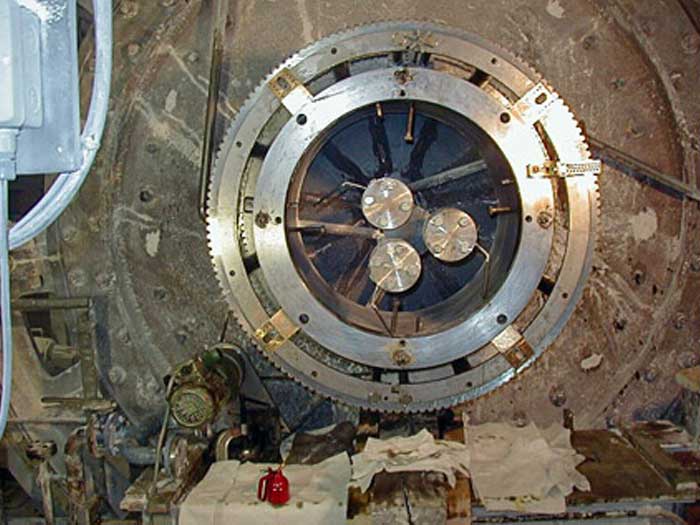 Setting the orbital machine on the bearing journal diameter (900mm x 600mm) cement mill. The journal needed machining due to damage and wear.