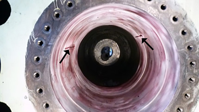 Cracks on the inside of the cylinder (wall thickness approximately 350 mm)